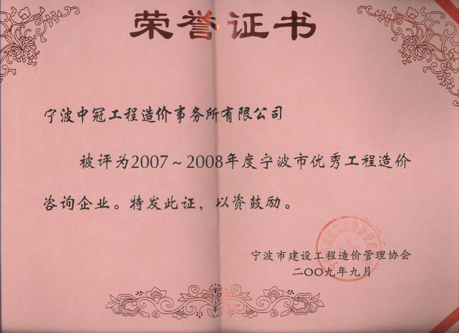 2007-2008年度寧波市優(yōu)秀工程造價咨詢企業(yè)榮譽證書-中冠榮譽-中冠咨詢-中冠工程管理咨詢有限公司