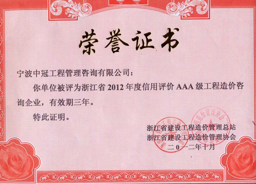 2012年度信用評價(jià)AAA級工程造價(jià)咨詢企業(yè)-中冠榮譽(yù)-中冠咨詢-中冠工程管理咨詢有限公司