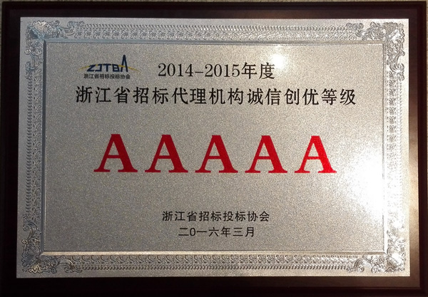 2014-2015年度浙江省招標(biāo)代理機(jī)構(gòu)誠信創(chuàng)優(yōu)等級AAAAA