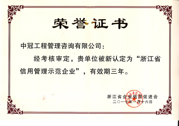 “浙江省信用管理示范企業(yè)”榮譽(yù)稱號(hào)-中冠榮譽(yù)-中冠咨詢-中冠工程管理咨詢有限公司