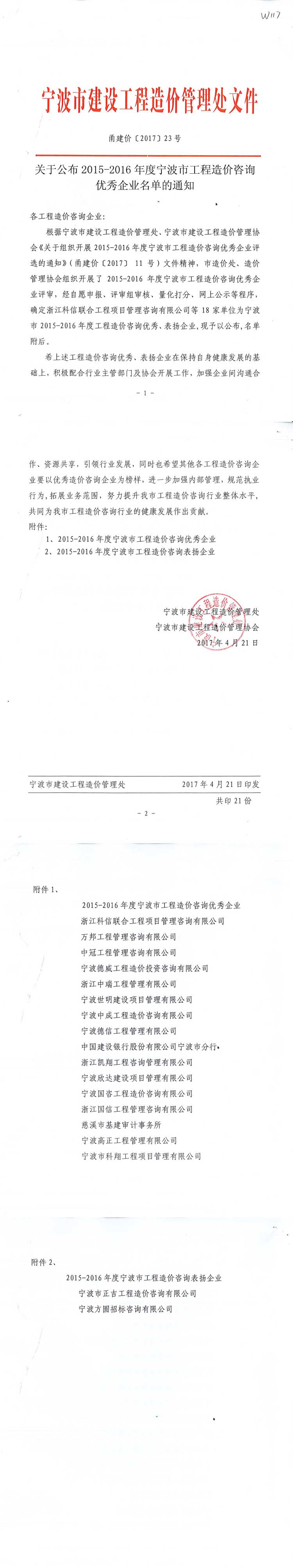 “2015-2016年度寧波市工程造價(jià)咨詢優(yōu)秀企業(yè)”榮譽(yù)稱號(hào)