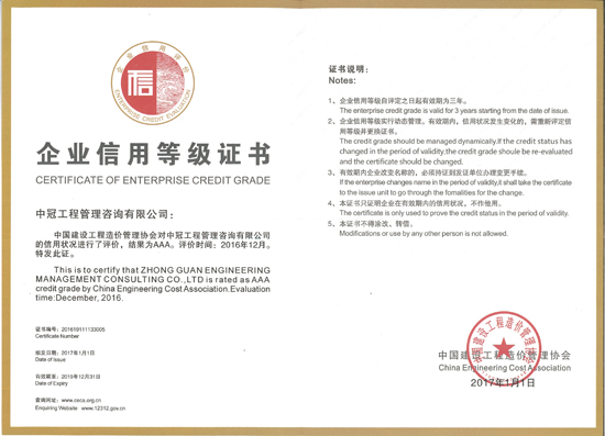 “中國建設(shè)工程造價(jià)管理協(xié)會(huì)企業(yè)信用評價(jià)AAA級信用企業(yè)”榮譽(yù)稱號-中冠榮譽(yù)-中冠咨詢-中冠工程管理咨詢有限公司